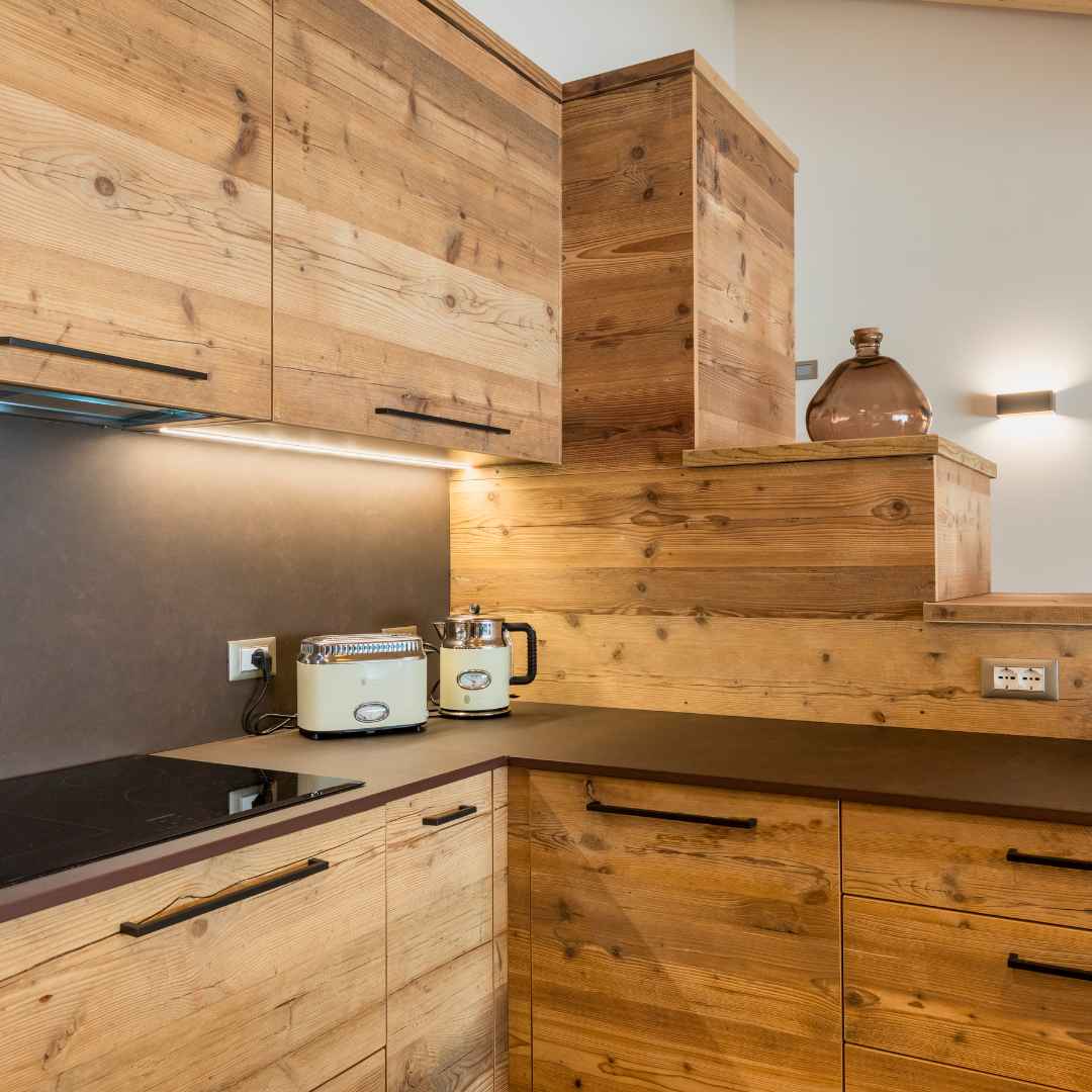 Tutto è stato realizzato in legno antico e di recupero per conferire calore e un aspetto rustico: il pannello cantiere, riconoscibile dalle venature marcate, dai nodi scuri e dalle leggere fenditure che ne raccontano l’origine. Lo ritroviamo nelle ante della cucina, nei frontali della libreria con illuminazione a LED, nella scala e nelle porte interne, creando un fil rouge caldo e materico.